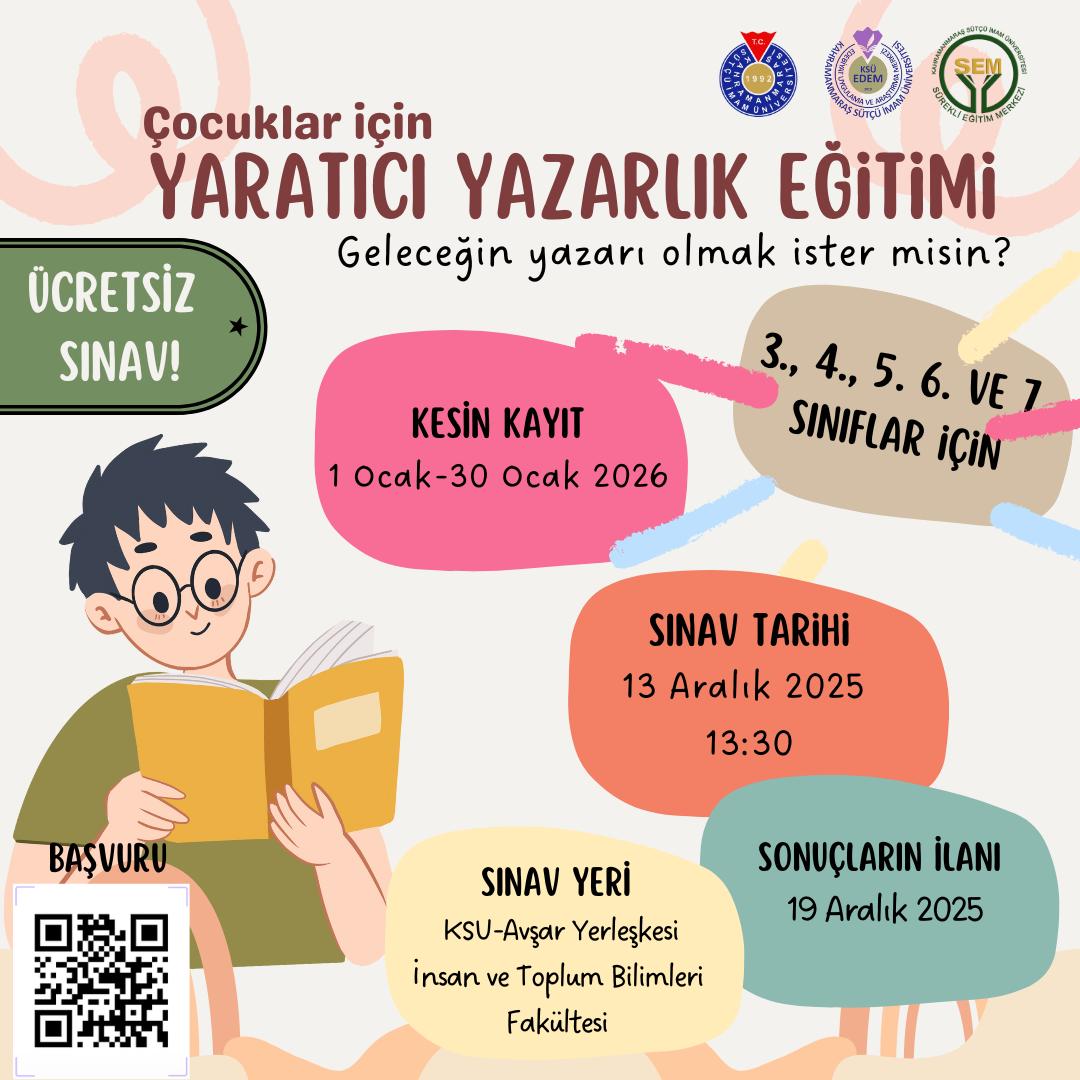 Eğitimin İçeriği:  Sınavda başarılı olan adaylar KSÜ SEM bünyesinde çocuklar için yaratıcı yazarlık eğitimi almaya hak kazanacaklardır. Süreç sonunda çocuk yazarlarımızın edebi ürünleri kitaplaştırılacaktır. Süreçle ilgili detaylı tüm bilgiler sınav sonuçları açıklandıktan sonra velilerle planlanan toplantı aracılığıyla aktarılacaktır.